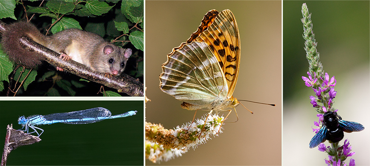 Een kleine greep uit het dierenleven langs rivier de Cèze. Van links naar rechts: relmuis (zevenslaper) – kanaaljuffer, keizersmantel en zwarte metselaar (Megachile parietina).